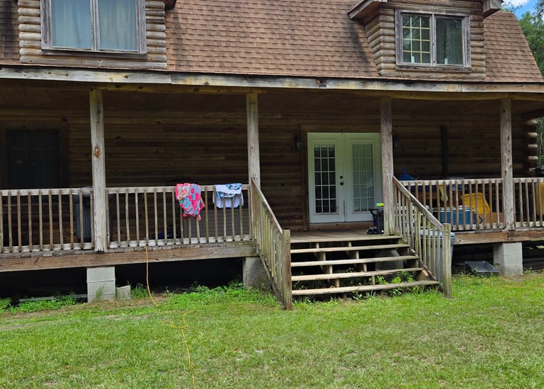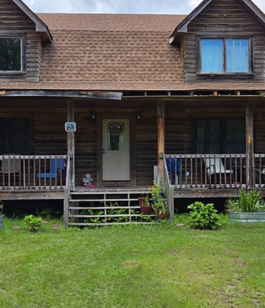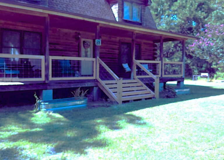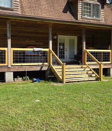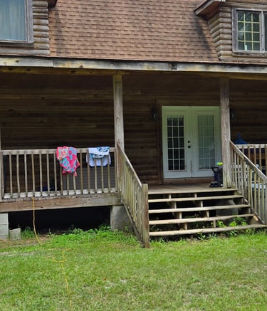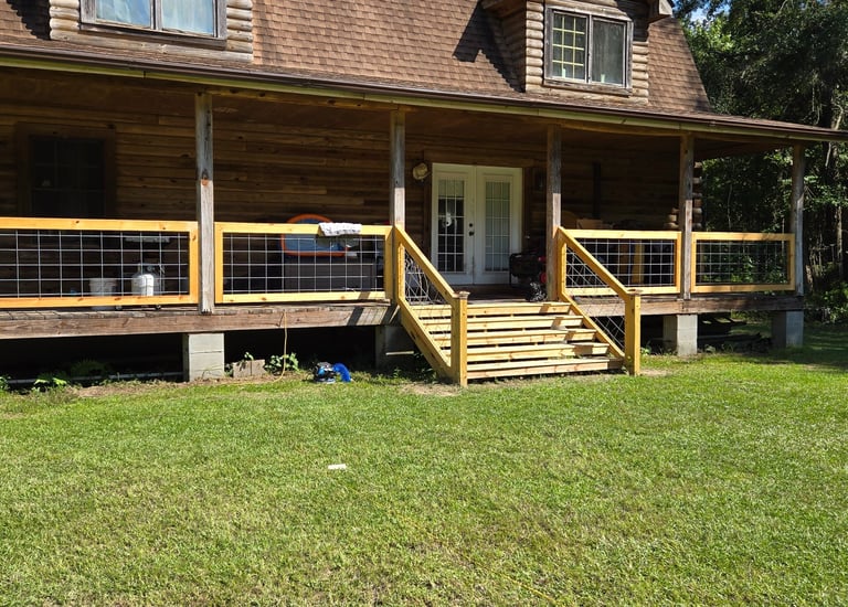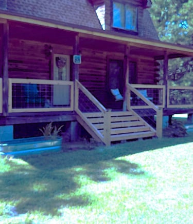 The homeowner wanted a rustic handrail. Something different than everyone else has and that goes with the esthetic of the log cabin. The homeowner is going to stain the wood in a few weeks after the wood has some time to dry.